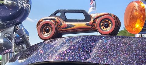 Die Griffschalen aus glasfaserverstärktem Kunststoff (GFK) – exakt dasselbe Material wie bei echten Buggy-Karosserien – sind mehrschichtig gefräst, poliert und ein echter Hingucker.